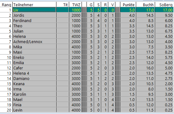 Für TuRa Schach war in der ODJEM- B Vanessa am Start und nach einem Start von 0 aus 3, konnte sie noch 5 Punkte aus 9 erspielen.