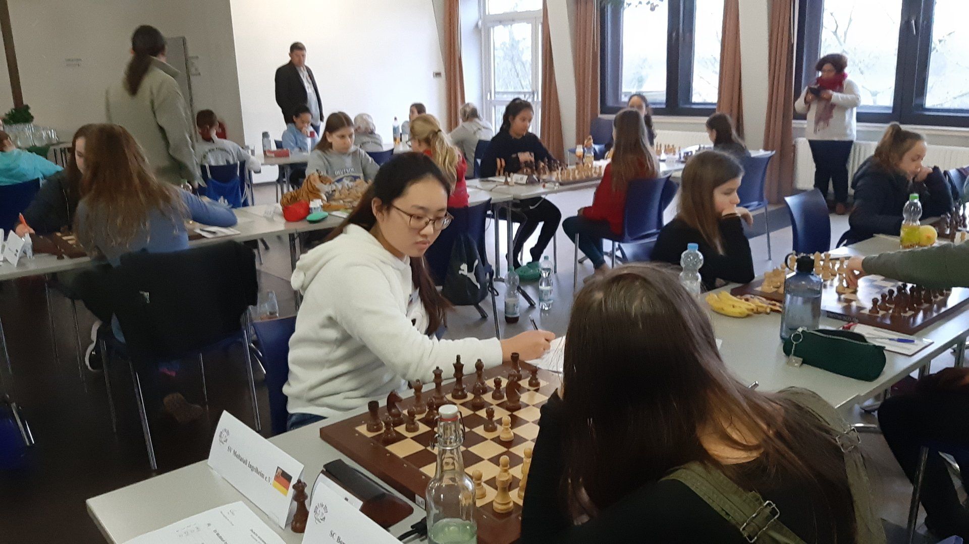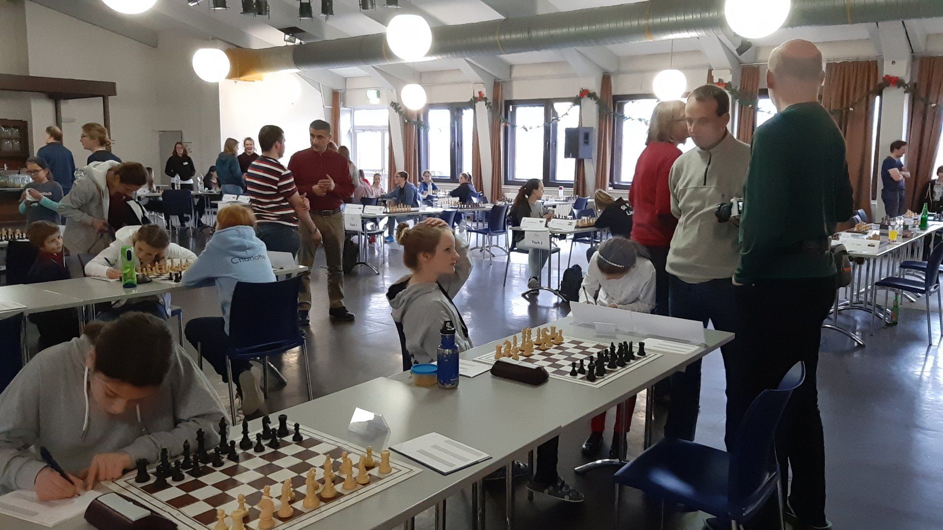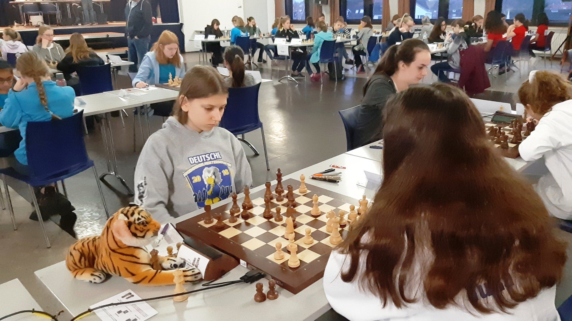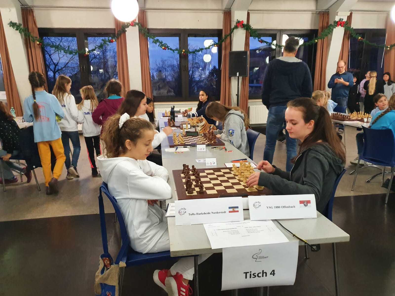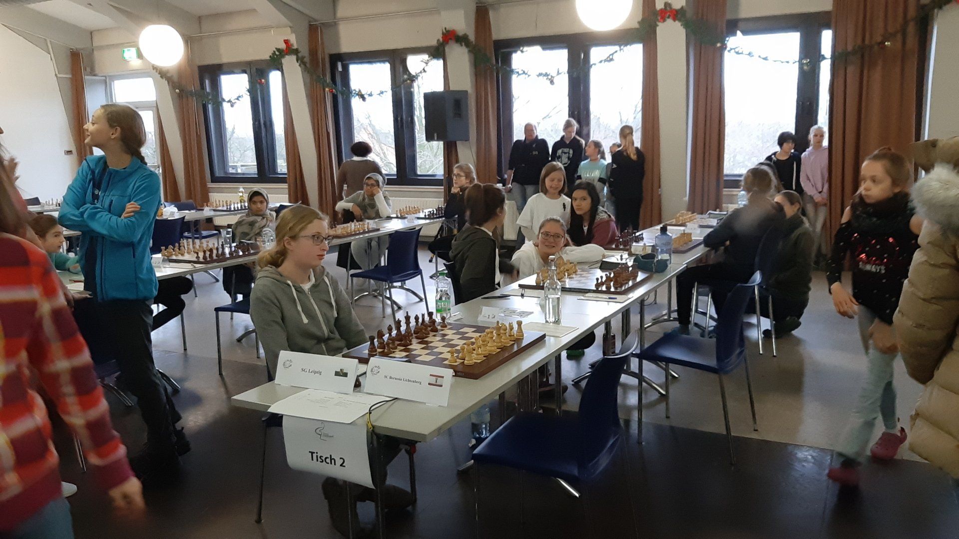 Pünktlich um 8.30 Uhr konnten Eberhard und dann Swenja die DVM der Mädchen U 14 eröffnen. Die 1. Runde ist dabei eher ein einsortieren,da die obere Hälfte gegen die untere Hälfte spielt.