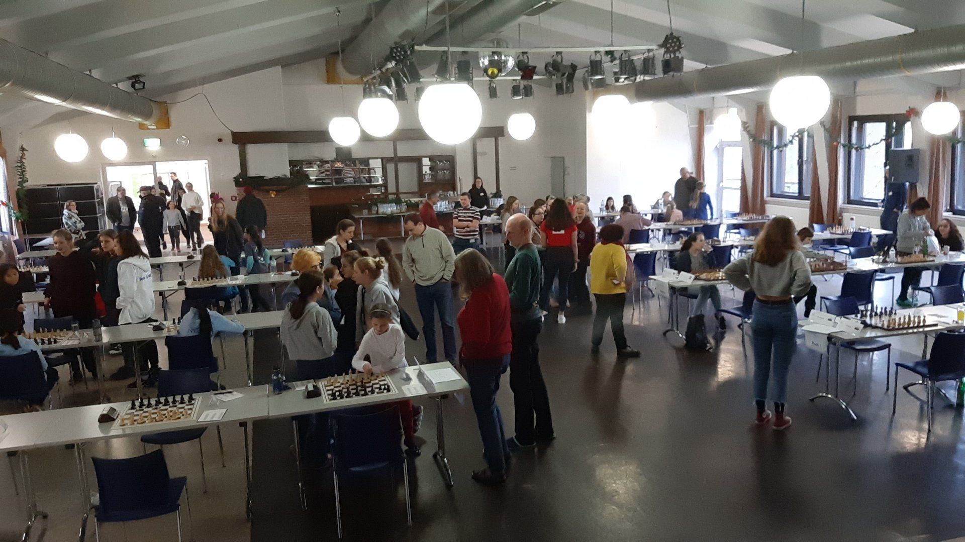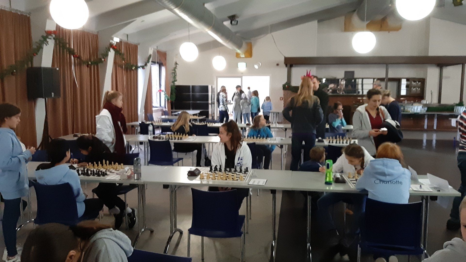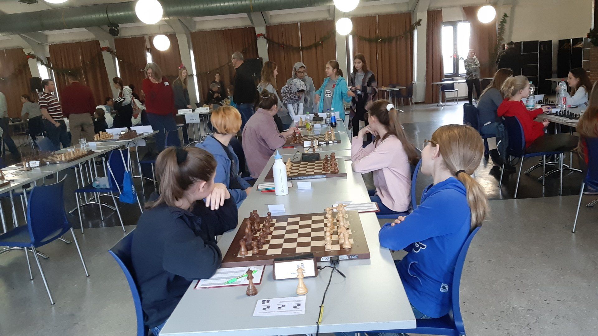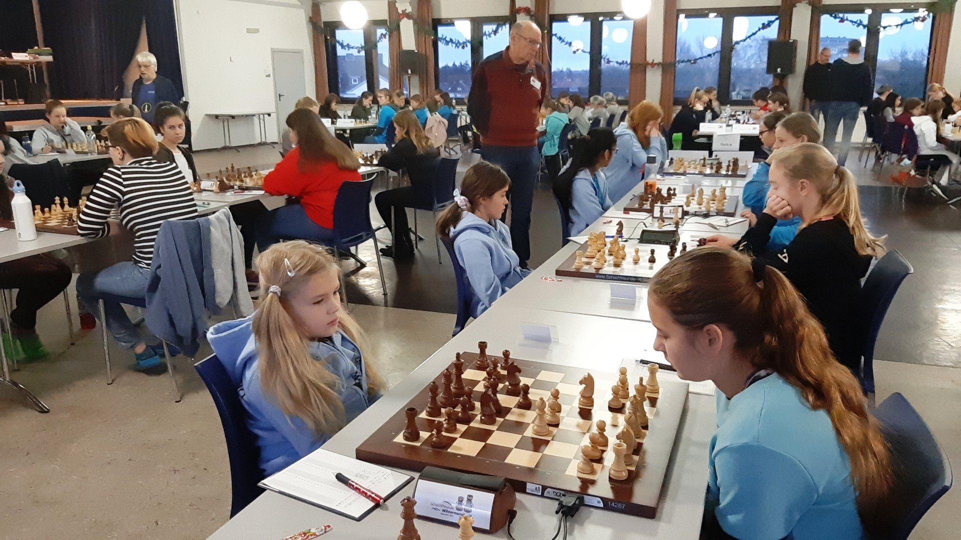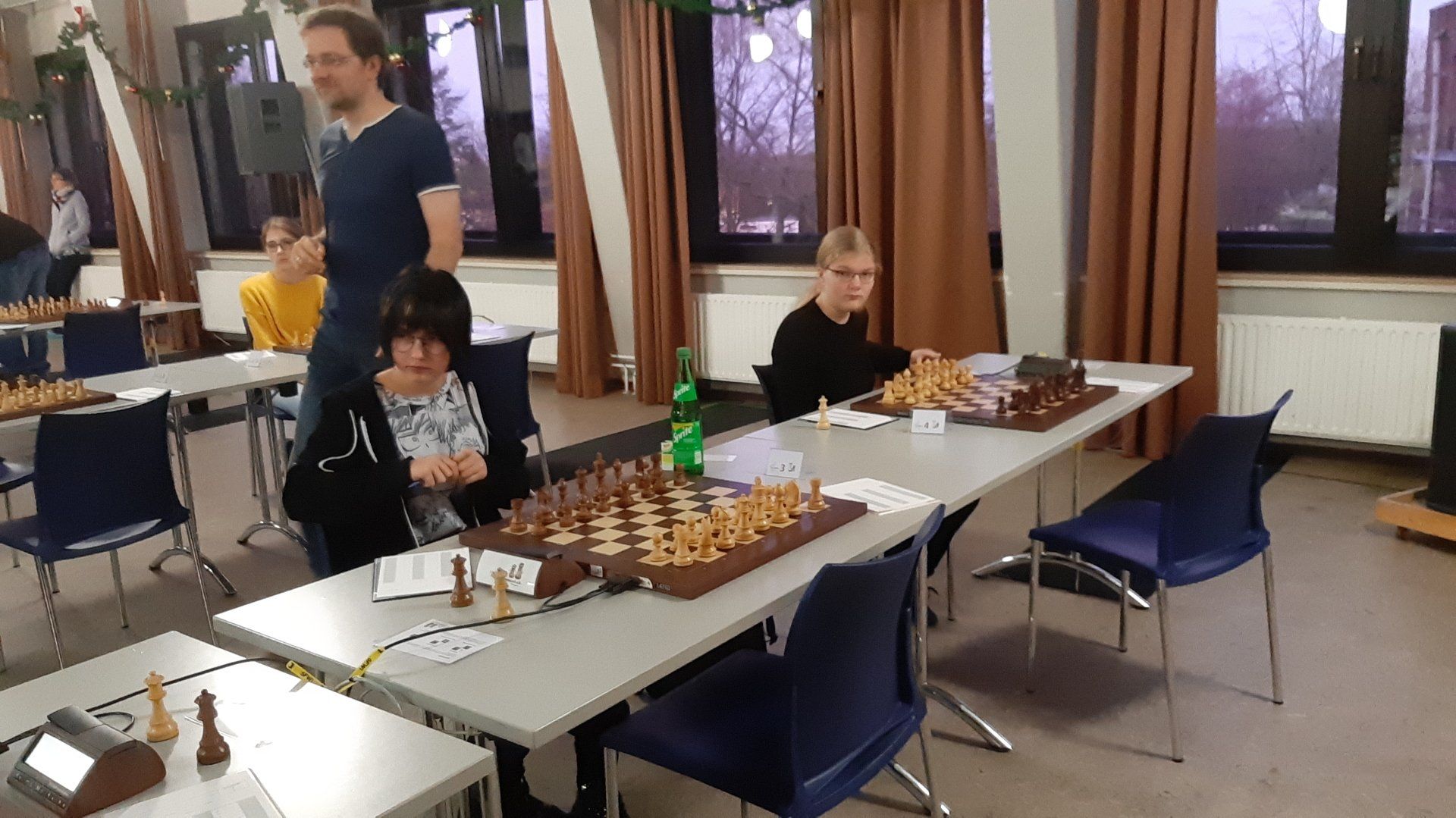 Pünktlich um 8.30 Uhr konnten Eberhard und dann Swenja die DVM der Mädchen U 14 eröffnen. Die 1. Runde ist dabei eher ein einsortieren,da die obere Hälfte gegen die untere Hälfte spielt.