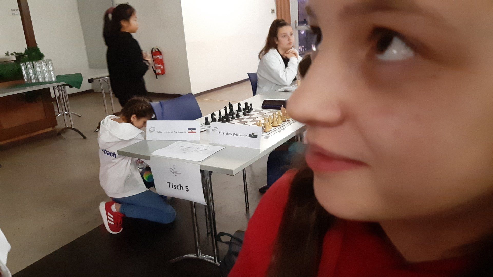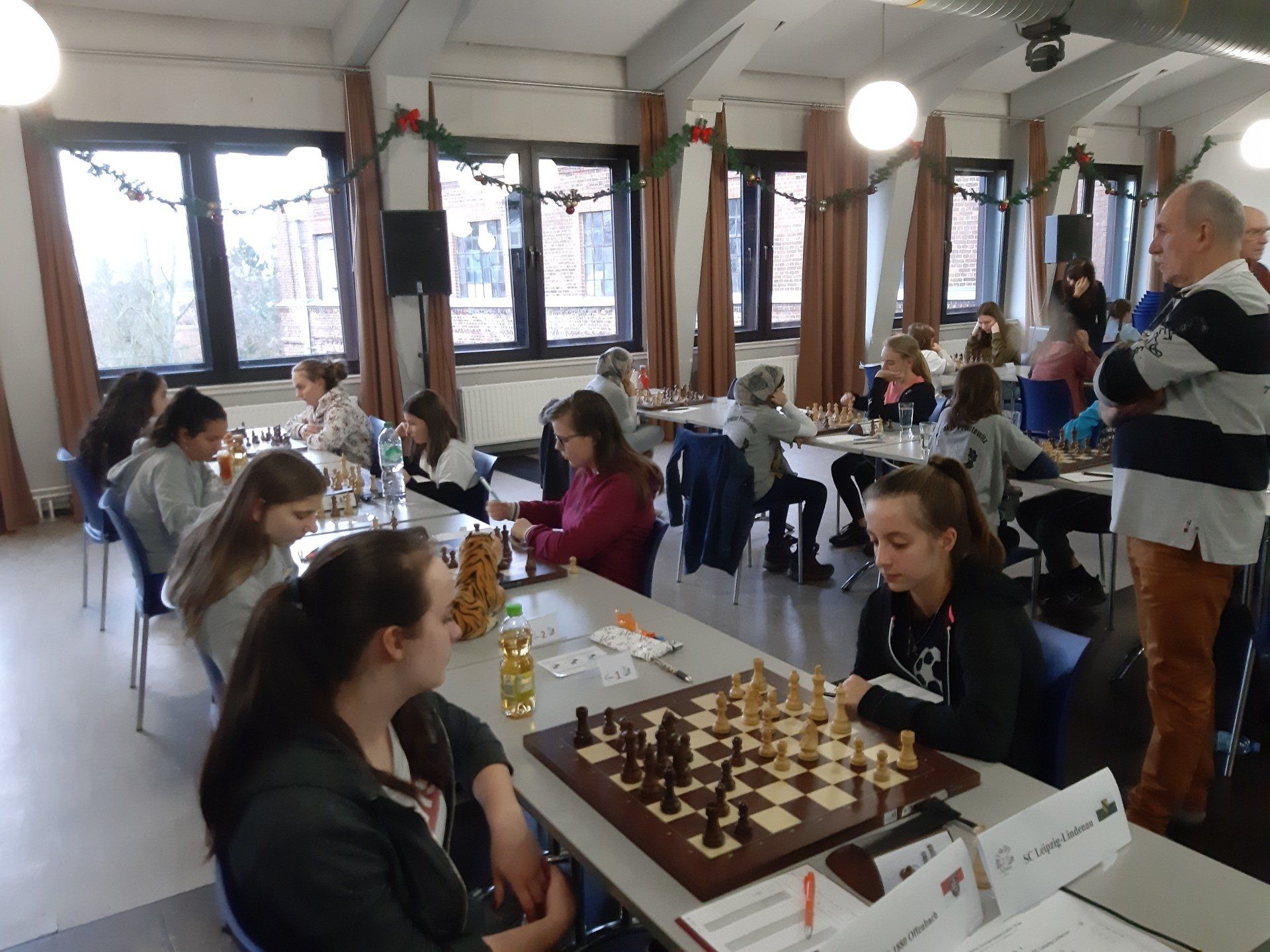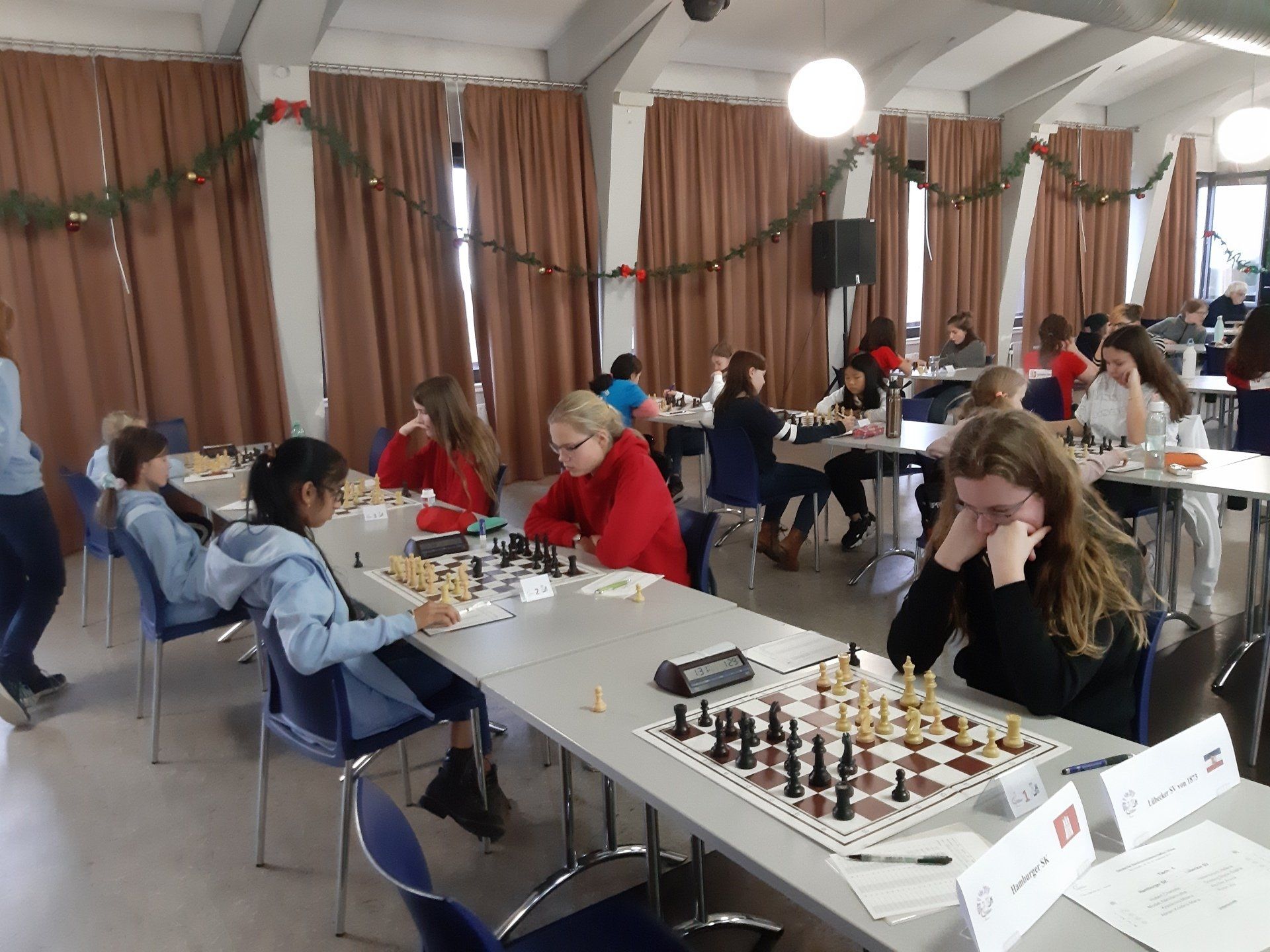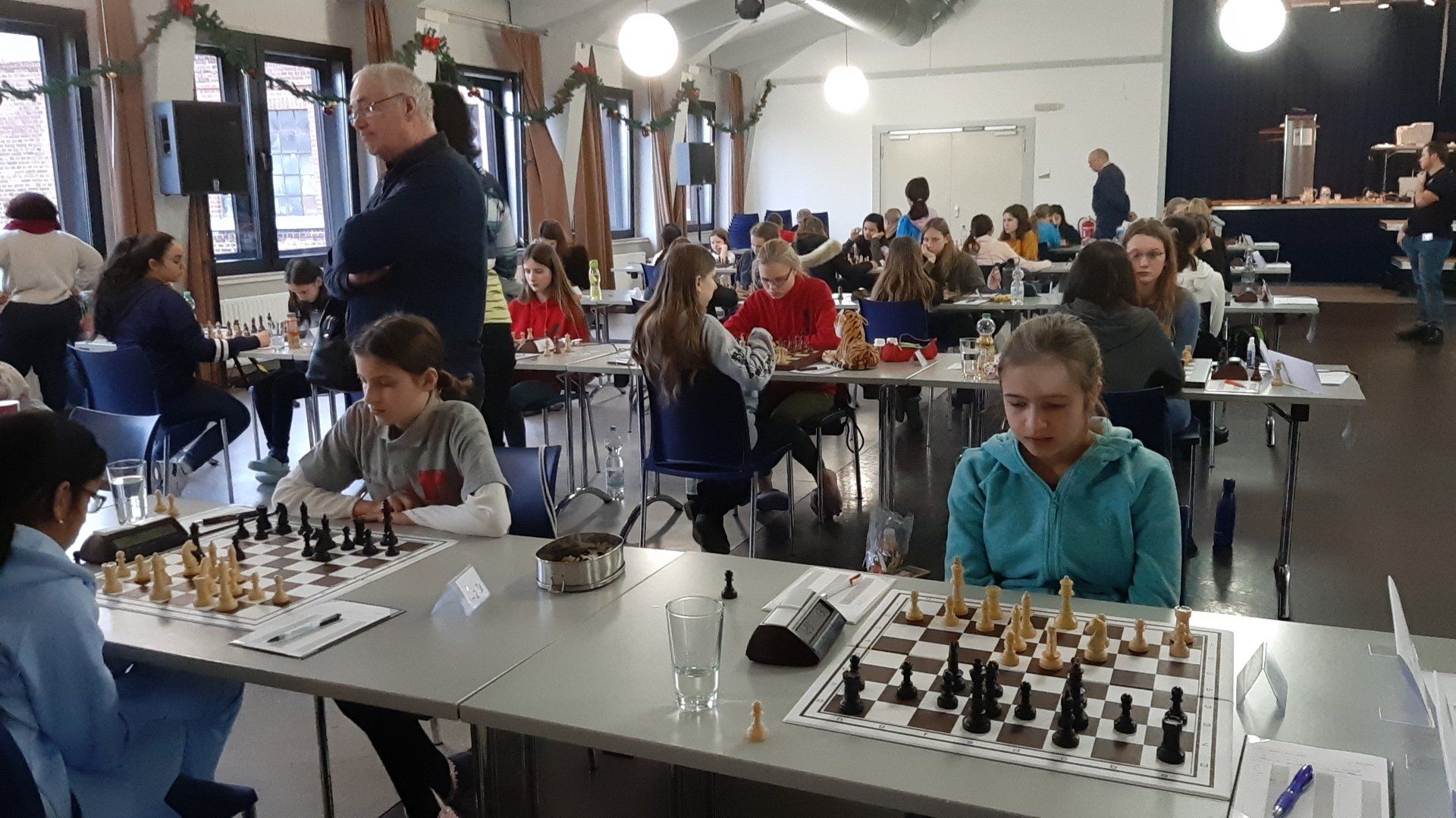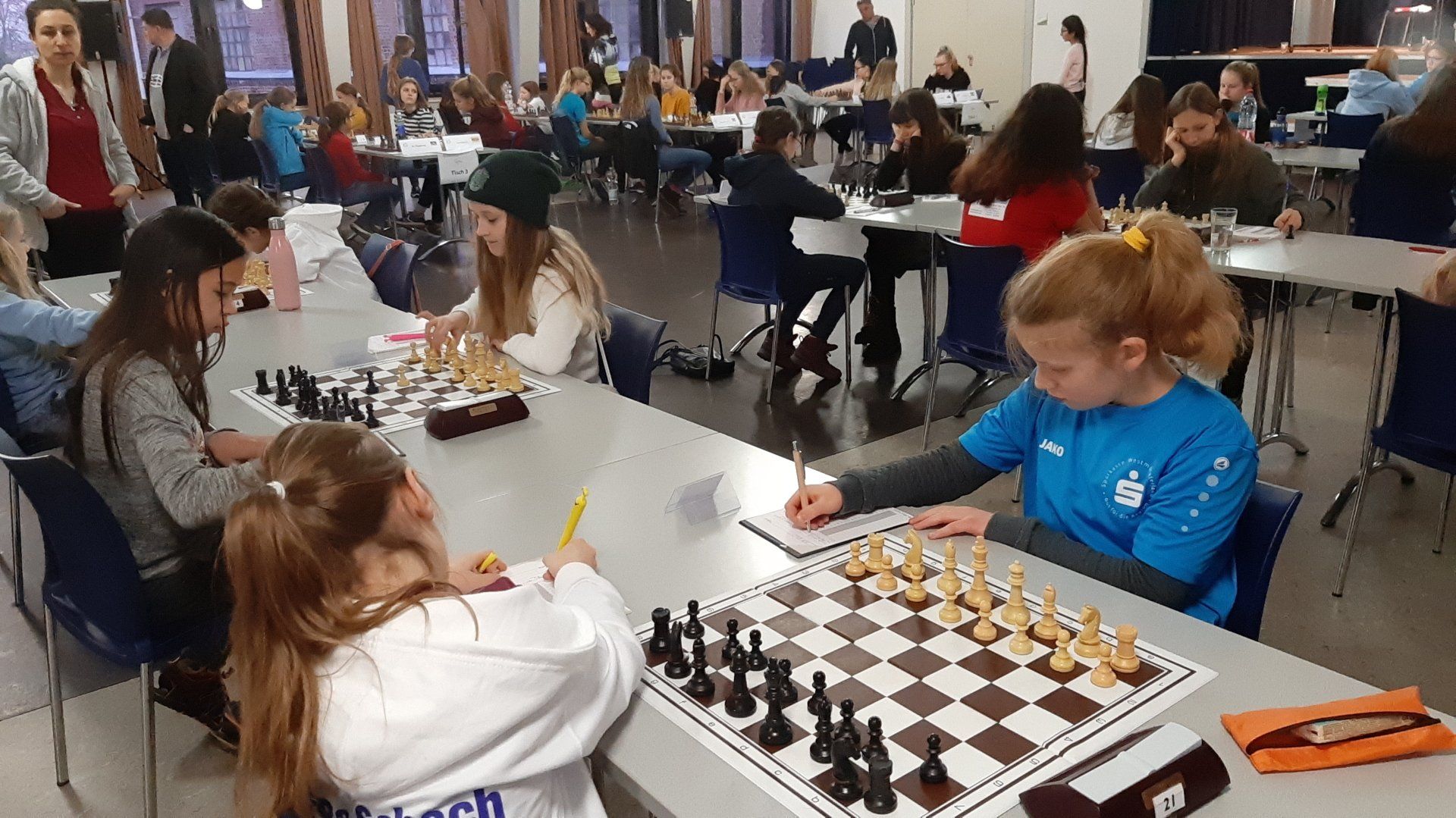 Pünktlich um 8.30 Uhr konnten Eberhard und dann Swenja die DVM der Mädchen U 14 eröffnen. Die 1. Runde ist dabei eher ein einsortieren,da die obere Hälfte gegen die untere Hälfte spielt.