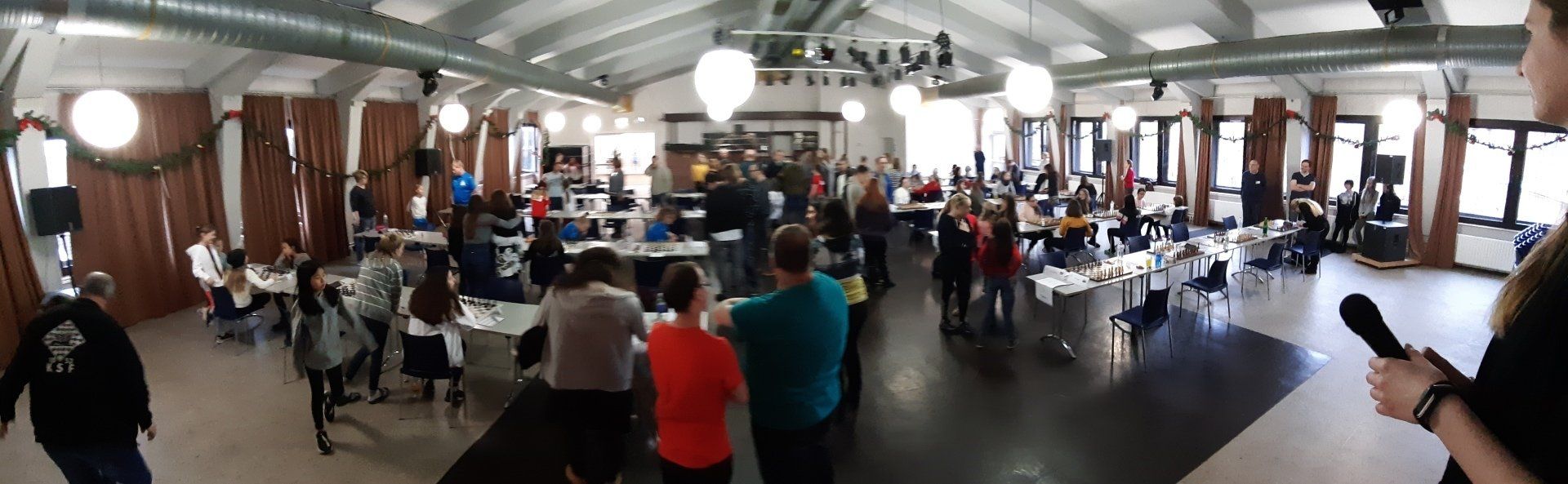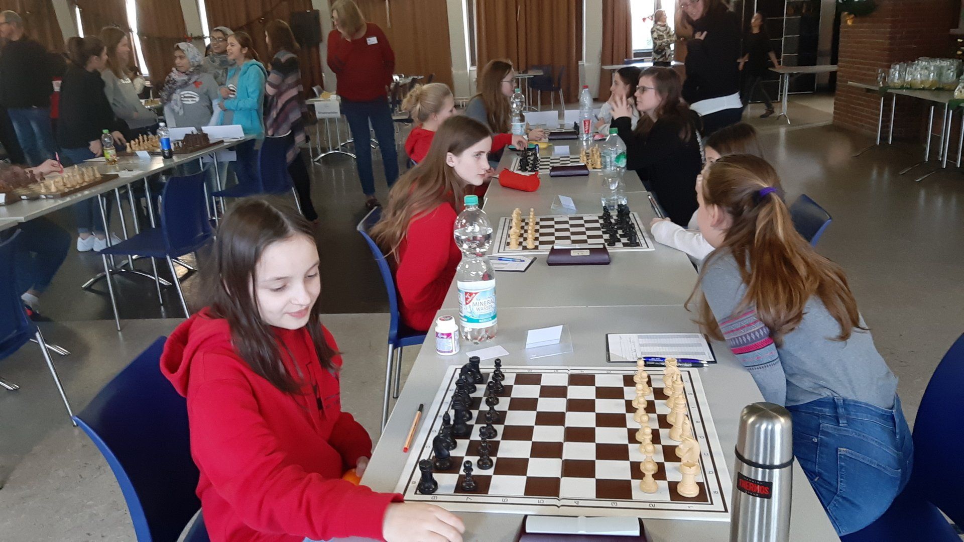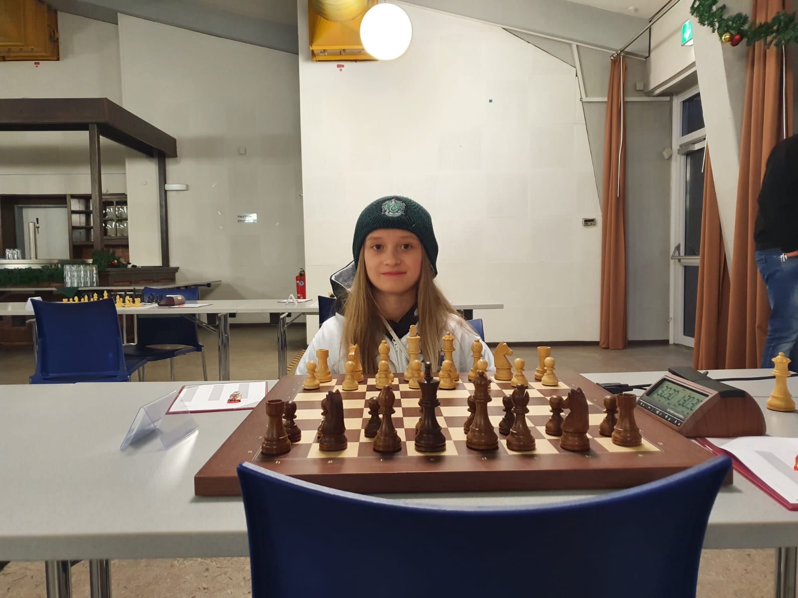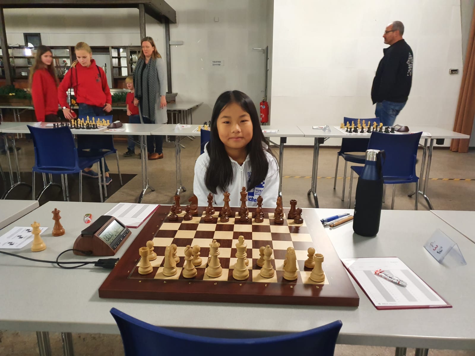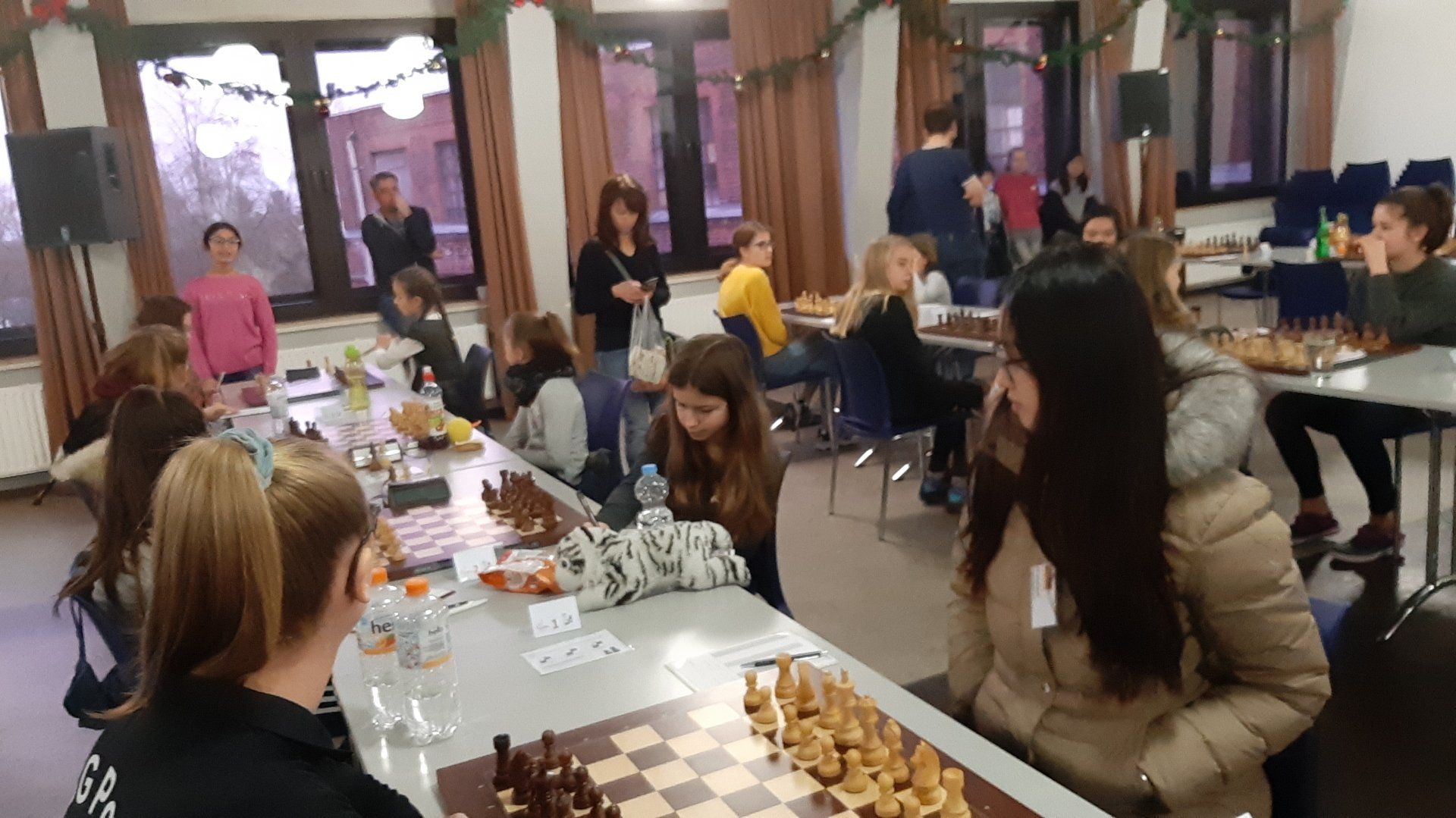 Pünktlich um 8.30 Uhr konnten Eberhard und dann Swenja die DVM der Mädchen U 14 eröffnen. Die 1. Runde ist dabei eher ein einsortieren,da die obere Hälfte gegen die untere Hälfte spielt.