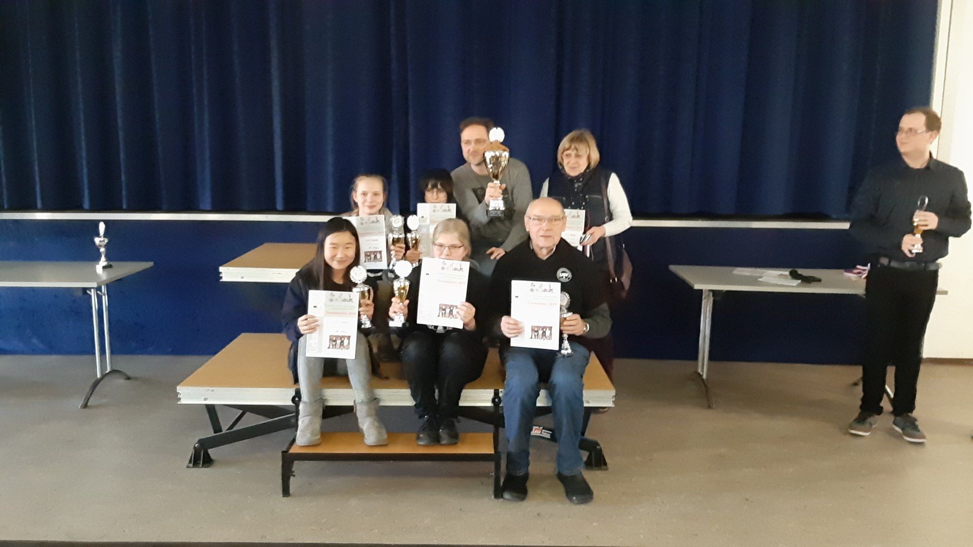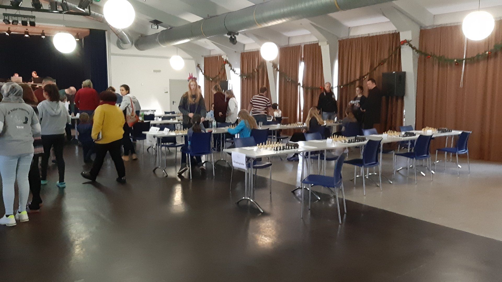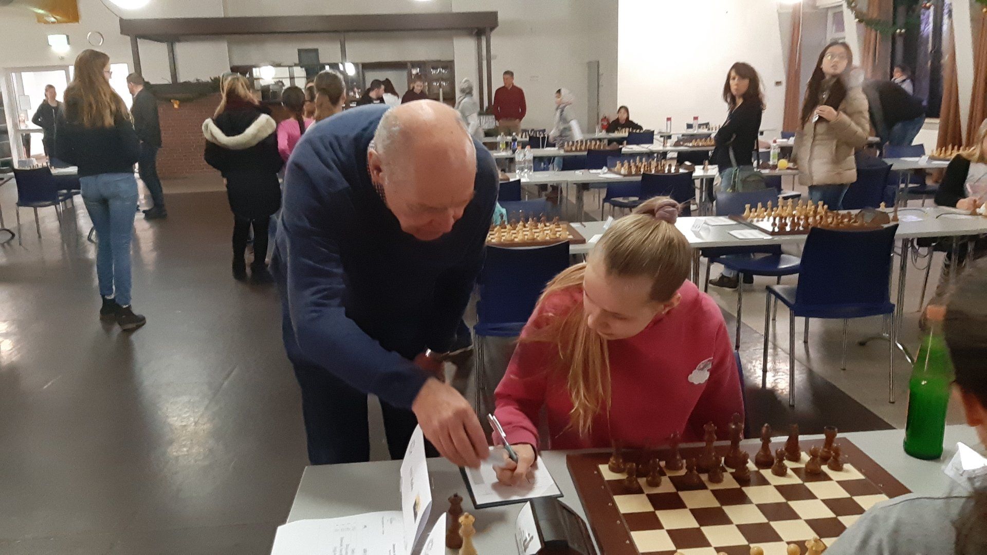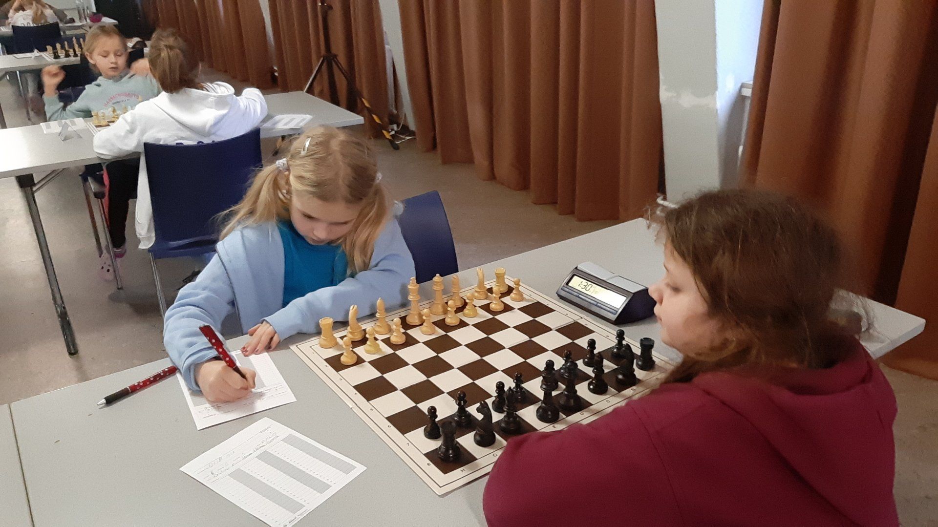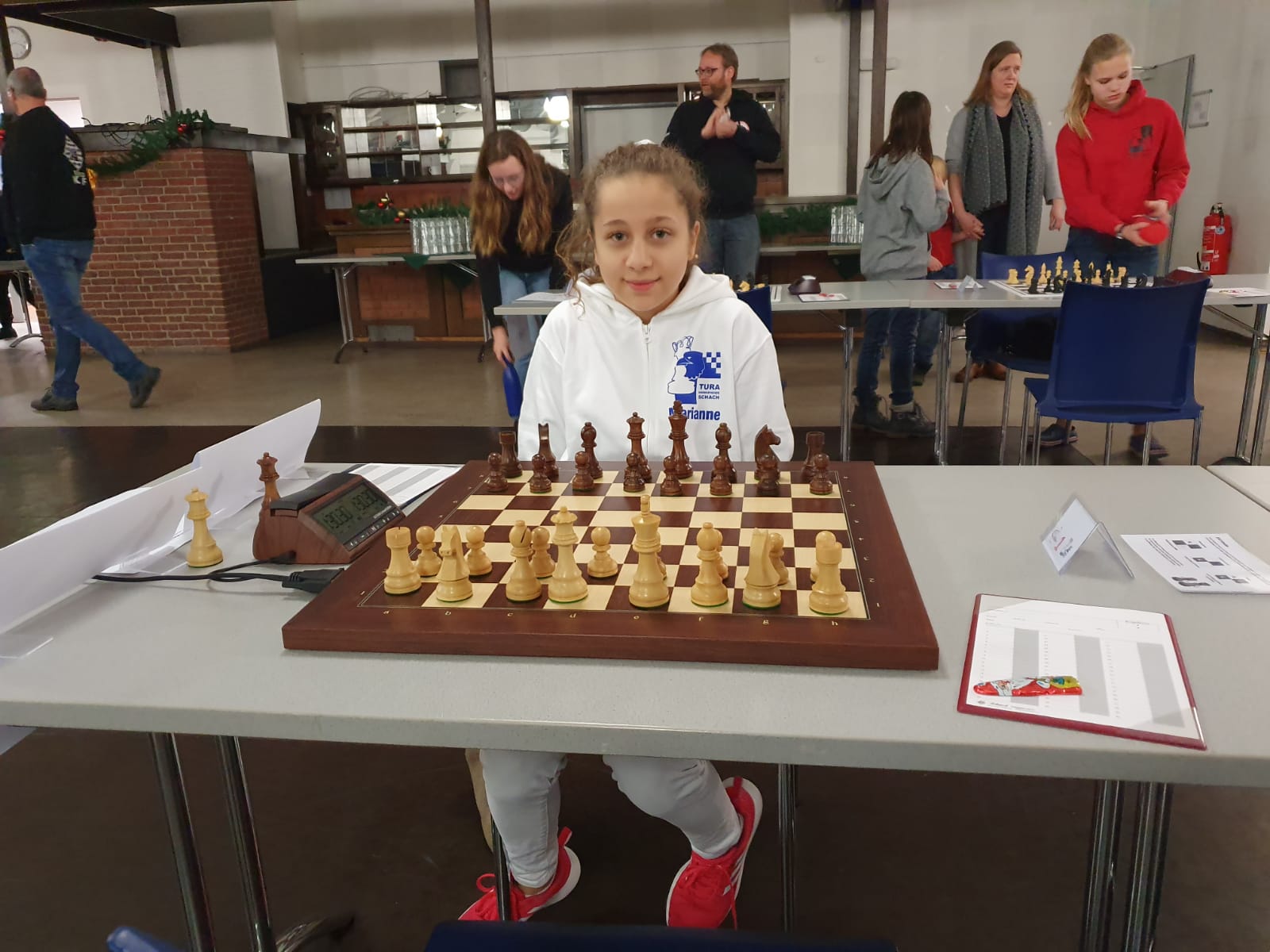 Pünktlich um 8.30 Uhr konnten Eberhard und dann Swenja die DVM der Mädchen U 14 eröffnen. Die 1. Runde ist dabei eher ein einsortieren,da die obere Hälfte gegen die untere Hälfte spielt.
