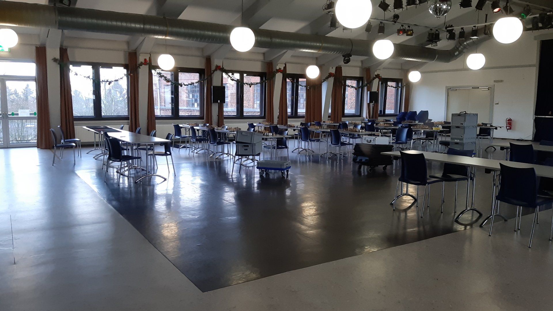 Es ist angerichtet und die ersten Gäste (Betreuer- Ehepaar aus Halle) sind auch schon eingetroffen. Die Live- Bretter (16) sind aufgebaut und werden getestet und im Foye ist alles für die Schlüsselübergabe vorbereitet.