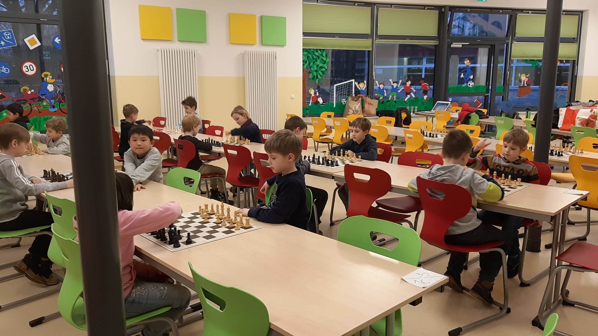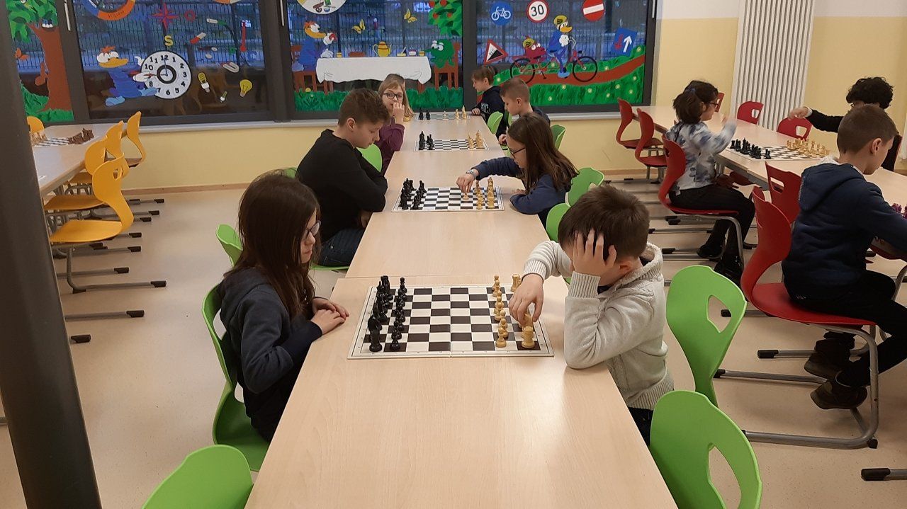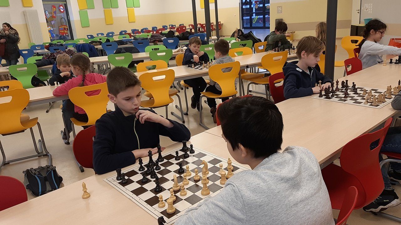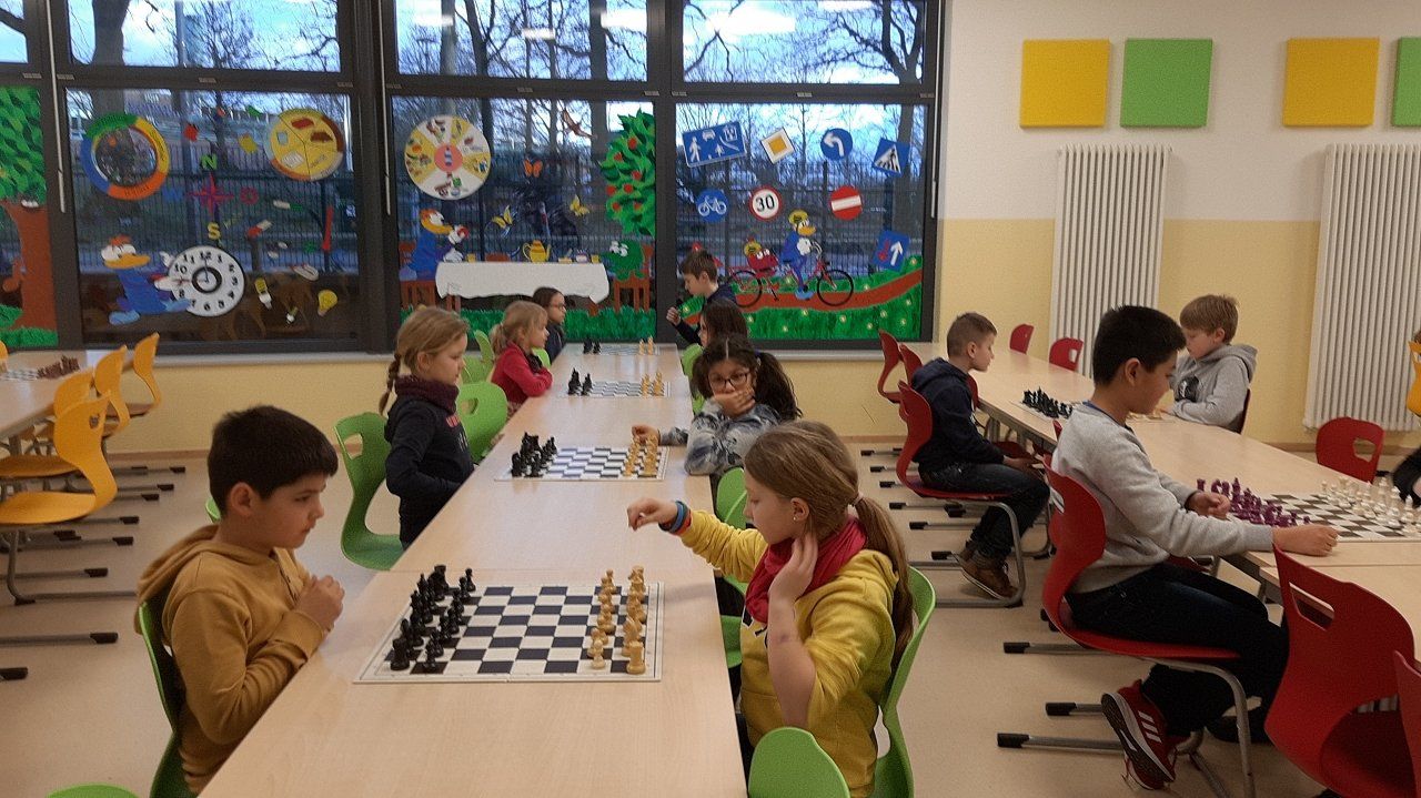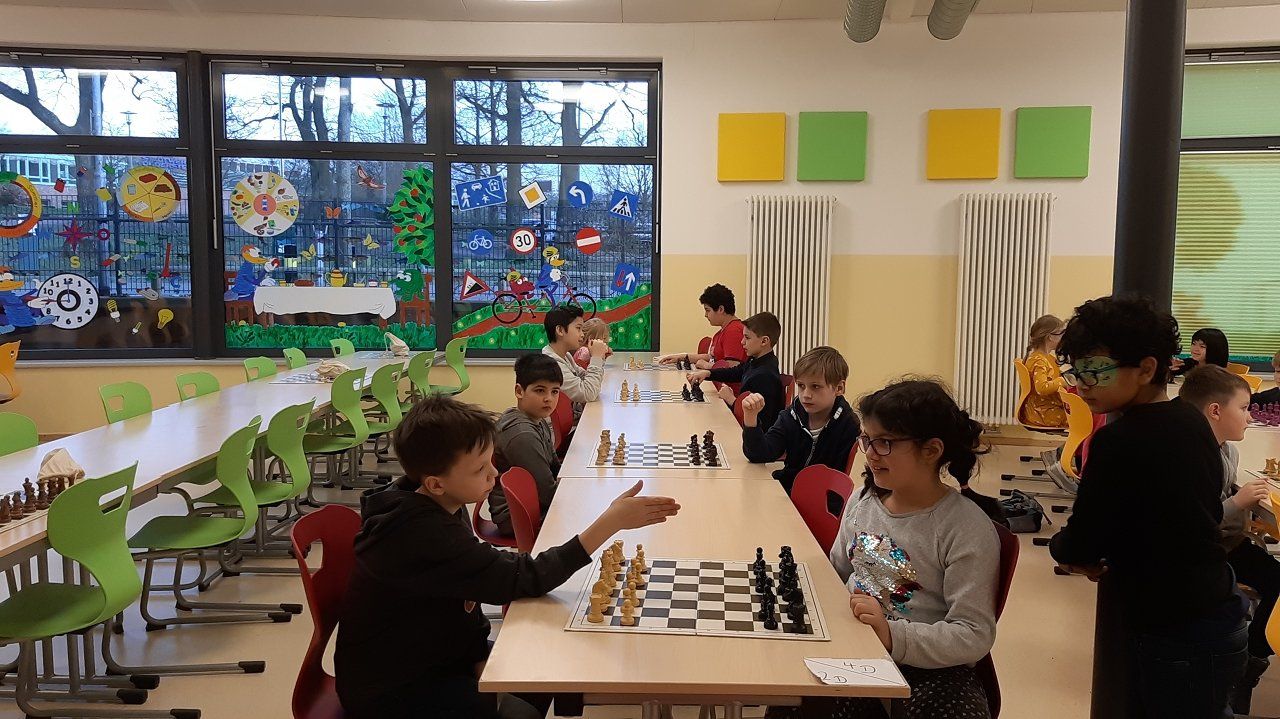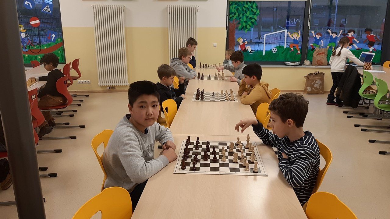 Montag 16.30 Uhr in der MENSA fer GS Heidberg! 20 Mädchen und Jungs sind vorbei gekommen, wobei wieder einige Kinder zum 1x bei einem Schachturnier unserer Serie "Schule trifft Verein" dabei gewesen sind.