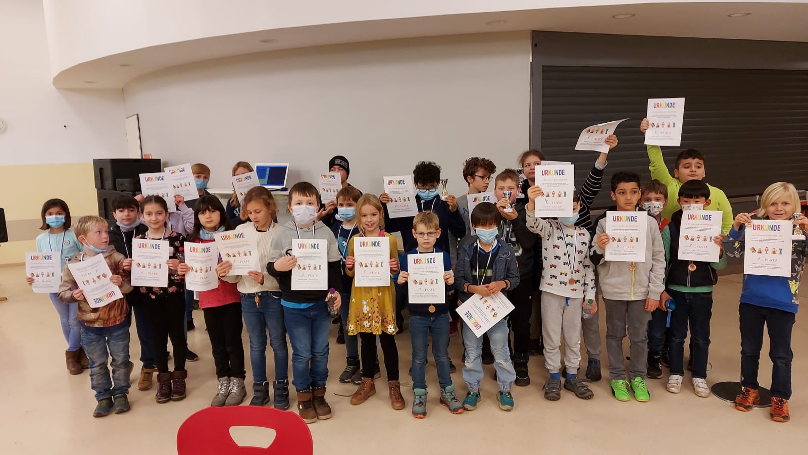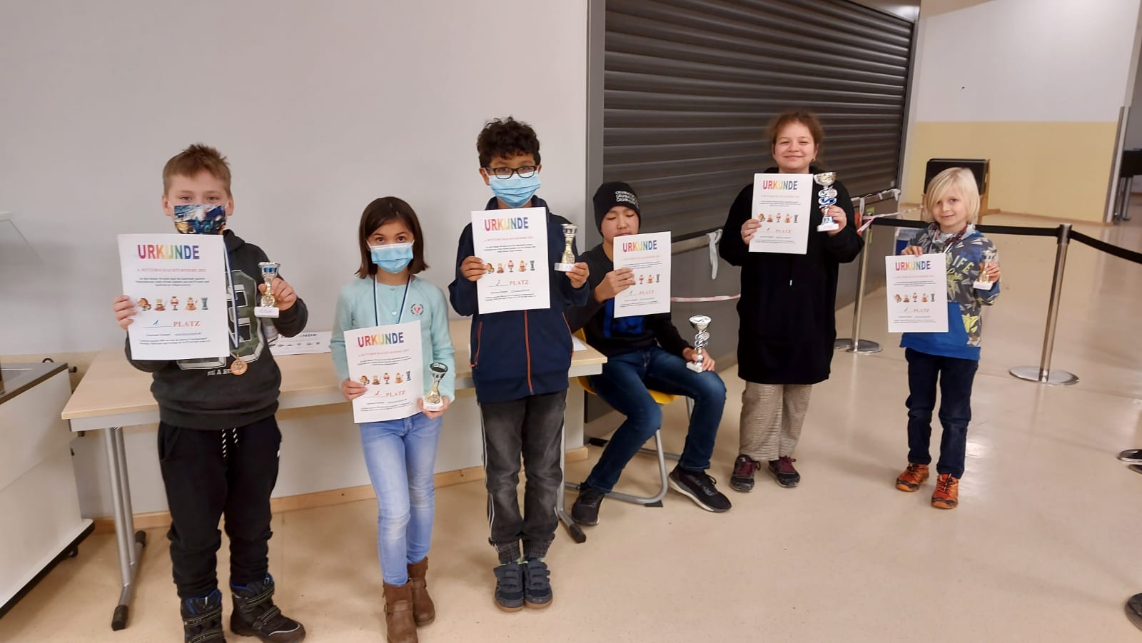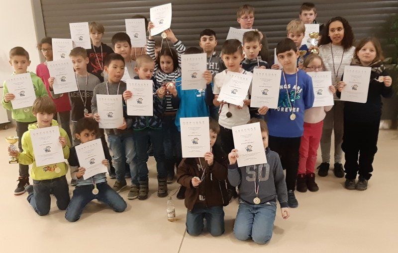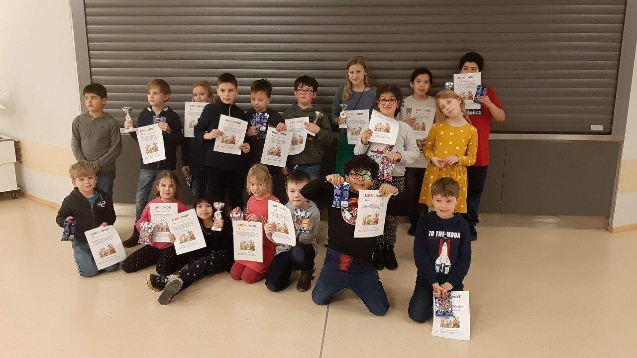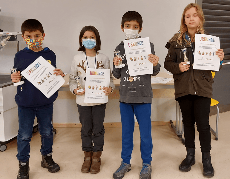 18 Mädchen und Jungs spielten 5 Runden und in 3 Kategorien gab es für Tim, Marvin und als Gesamtsieger Julien einen Pokal. Alle Anderen erhielten eine kleine Ritter o. ä. Figur bzw ein kleines Magnettier.