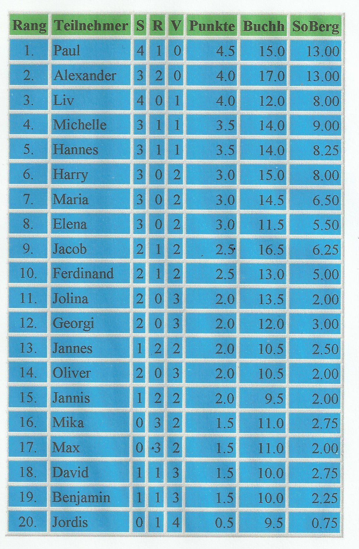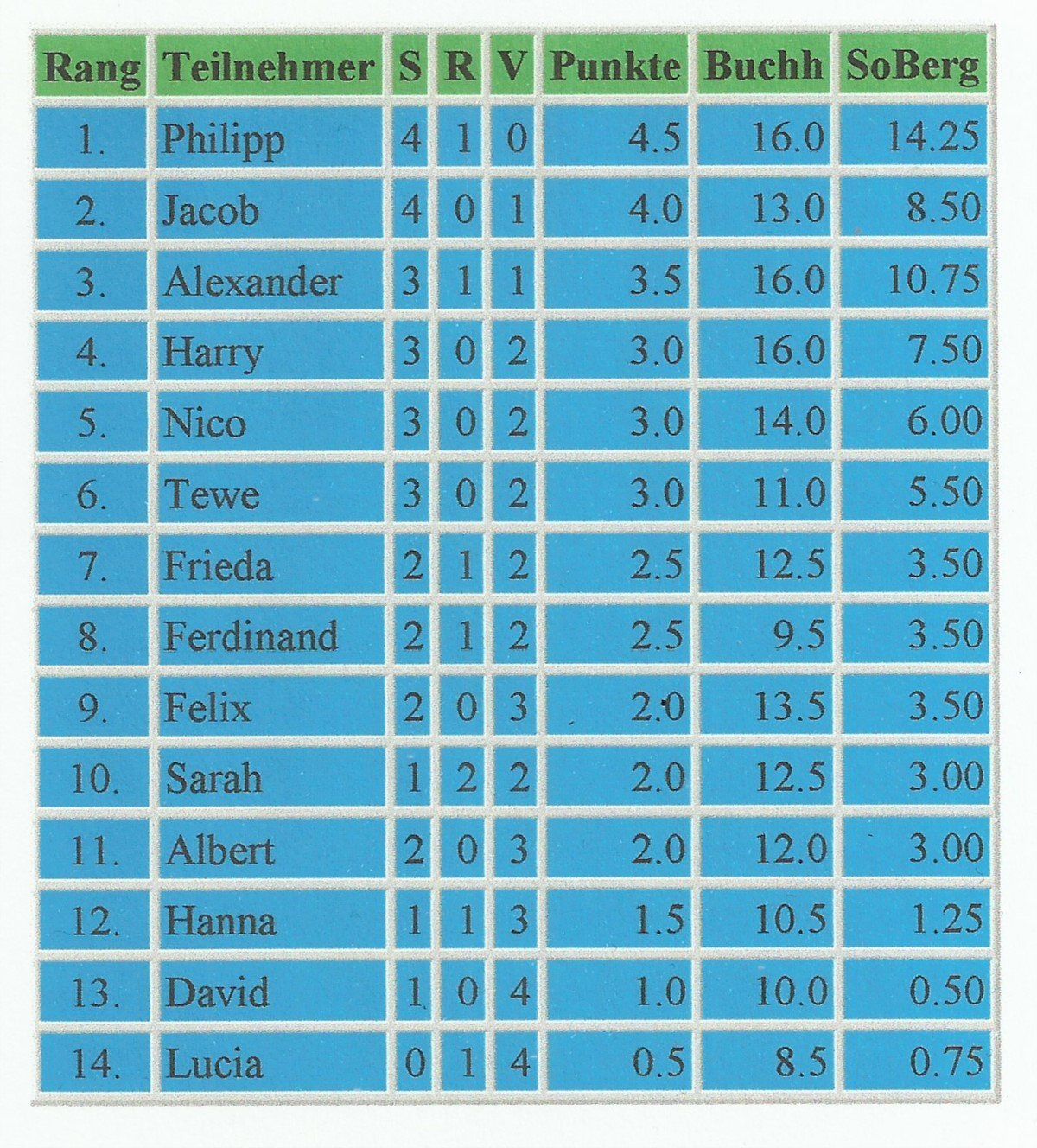 Rang Teilnehmer S R V Punkte